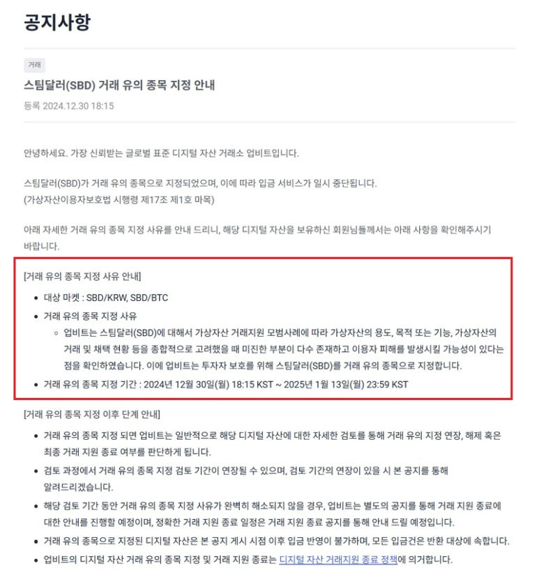 그럼 유의종목 지정에 대한 공지사항을 같이 한번 살펴보도록 하겠습니다. 스팀달러 코인은 해당 프로젝트에 대해서 종합적으로 고려해봤을 때 미비한 부분이 많아서 이러한 결정을 했다고 합니다. 유의종목은 지난해 12월 30일에 지정되었으며, 1월 13일에 그 운명이 결정된다고 합니다. 개인적인 생각이지만 상폐쪽으로 무게를 두는 것이 맞지 않나 싶습니다.