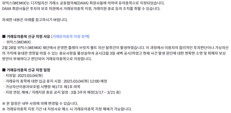 위믹스 코인이 디지털자산 거래소 공동협의체(DAXA) 회원사들에 의해 거래유의종목으로 지정되었습니다. 거래유의종목 신규 지정 사유는 2월 28일, 위믹스(WEMIX) 재단이 운영한 플래키 브릿지 볼트 자산 탈취 사건이 발생하였습니다.
