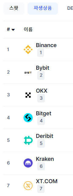 현재 1위 바이낸스 2위 바이비트 3위 okx 순서입니다 바이낸스와 okx 바이비트는 세계 코인 선물시장의 절반 가까운 시장을 형성하고 있습니다. 사실 두 거래소는 글로벌 TOP2 거래소에 랭크 되어 있는 만큼 여러 장점이 있고 이용에 불편함이 별로 없는 편입니다