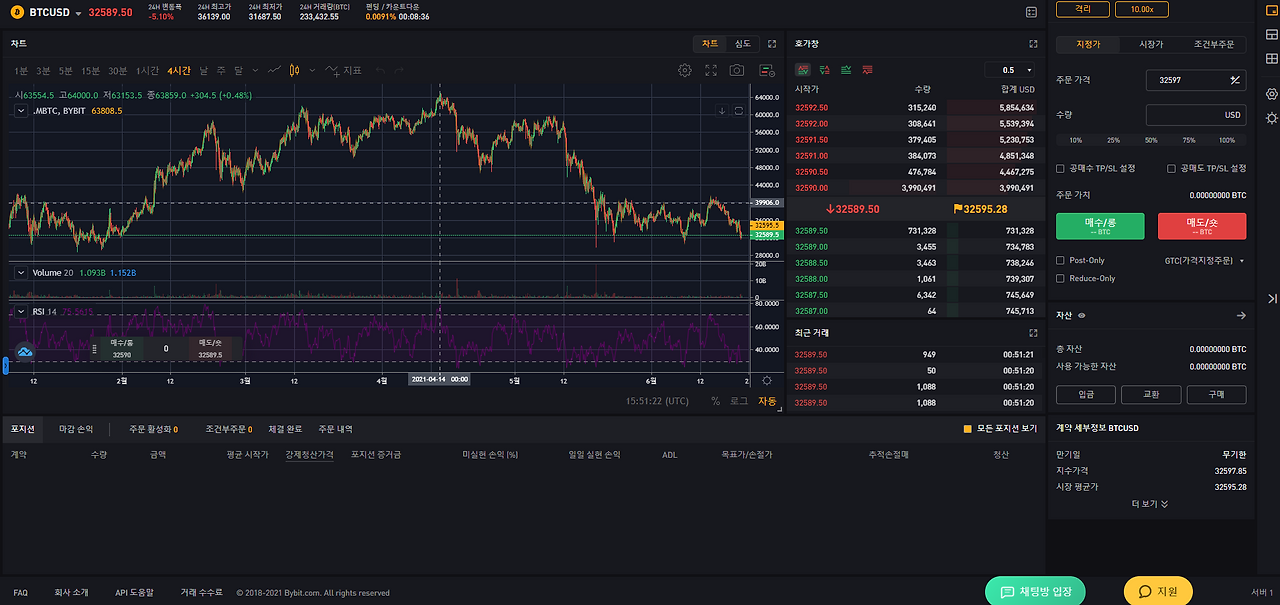 상단메뉴에서 거래하기 - USDT무기한 계약에서 거래하고자 하는 코인을 선택합니다.처음하시는 경우에는 비트코인부터 시작하는 것이 좋은데요 마진거래의 경우 레버리지가 최대 100배까지 가능하기에 변동성이 너무 큰 알트코인들을 처음부터 할 필요는 없기 때문입니다