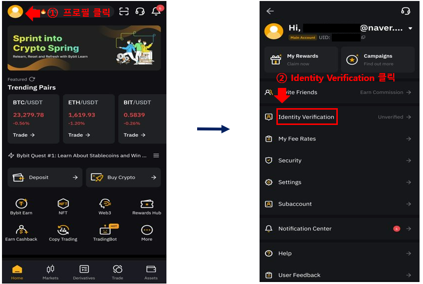 1) 좌측상단 프로필 클릭 후 Identity Verification 클릭