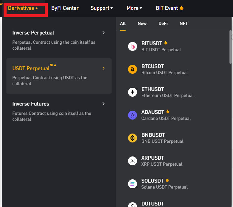 이제 홈페이지 상단에 Derivatives를 눌러주고 USDT Perpetual(usdt무기한)을 눌러줍니다 다양한 종목이 뜨면 여기서 내가 투자하고 싶은 종목을 골라서 선물거래를 진행하시면 됩니다
