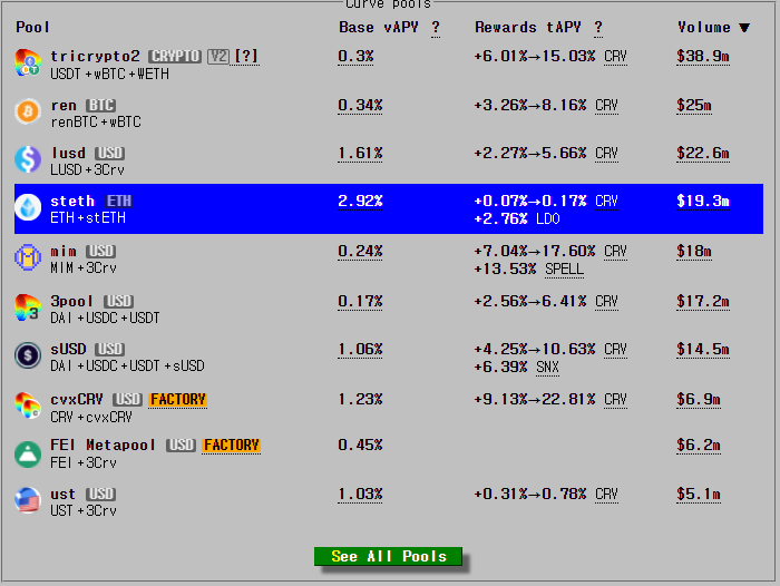 유니스왑이 이더리움 기반 ERC-20 토큰들의 스왑 거래를 지원하는 탈중앙화된 거래 유동성 거래 플랫폼이라면, 커브 파이낸스는 스테이블코인에 집중하여 거래자들은 간편하게 스테이블코인들을 교환 거래 위주로 지원을 하는 것입니다