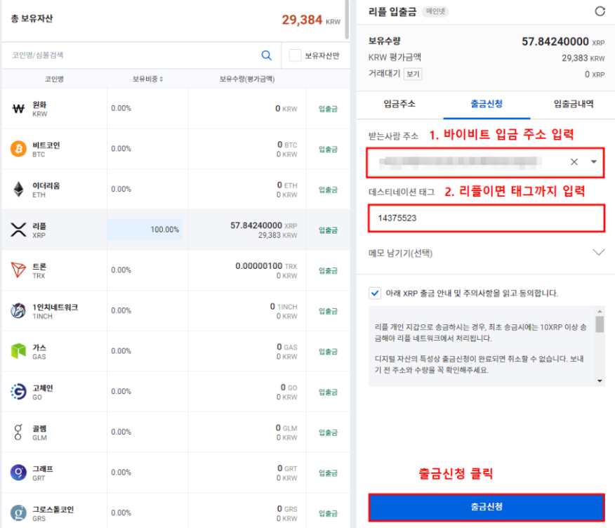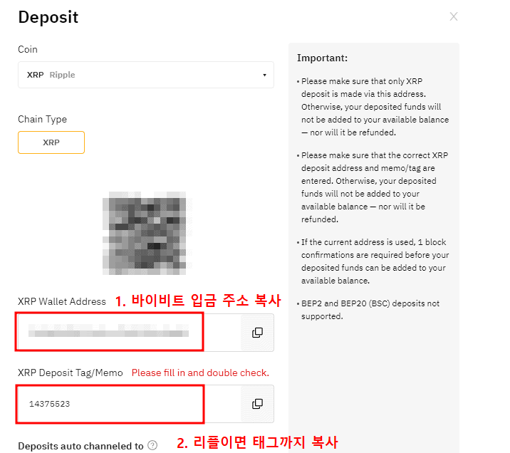 바이비트 입금 주소와 리플이면 태그까지 복사를 해줍니다.