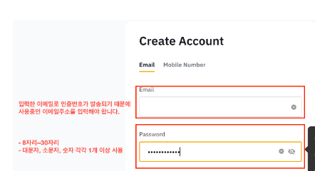 이메일로 가입 할 경우, 실제 이용자의 이메일인지 확인을 위해 인증번호가 발송되기 때문에, 꼭 메일을 수신할 수 있는 본인의 이메일 주소를 입력해야 합니다. 비밀번호는 최소 8자리 이상에 대문자, 소문자 그리고 특수문자가 각각 1개 이상이 반드시 들어가야 합니다