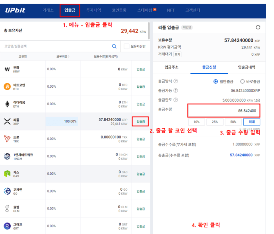 상단 메뉴 – 입출금 클릭 -> 출금하실 코인 입출금 클릭