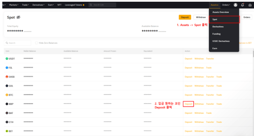 KYC 인증한 바이비트 계정으로 로그인을 하신 후 Assets -> Spot 클릭,