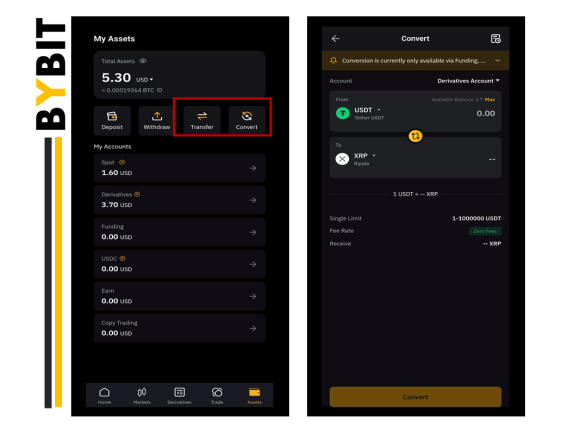 다시 바이비트 어플로 돌아와 입금이 되었는 것을 확인했으면 코인을 달러와 같은 USDT로 교환을 해줘야 하는데요