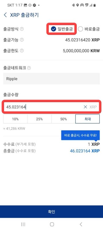 출금하기 버튼을 눌렀다면 이어서 출금방식은 ‘일반출금’을 선택하고, 출금할 리플 코인 수량을 입력해줍니다 그리고 이어서 출금 네트워크(Ripple)를 다시 한번 확인한 뒤, 확인 버튼을 눌러주면 됩니다