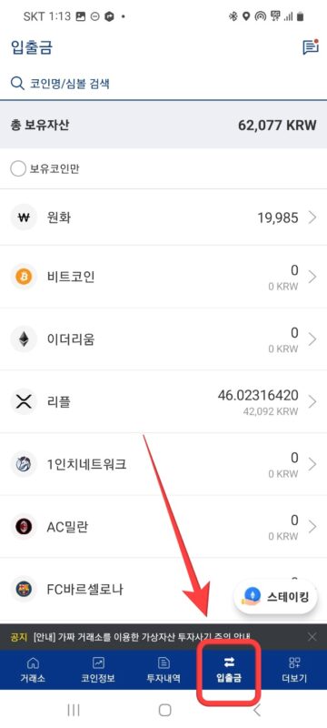 해외 거래소의 경우 국내 결제가 어렵기 때문에 업비트에서 코인을 구매한 후 입출금을 진행해줘야 합니다. 우선 업비트에서 입금받을 코인주소를 확인하기 위해 하단에 있는 'asset'-'deposit'에서 원하는 코인을 선택하면 주소를 확인할 수 있습니다.
