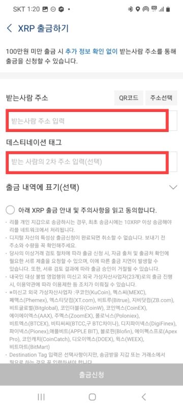 확인 버튼을 누르면 리플 코인을 받을 주소와 데스티네이션 태그를 입력하는 란이 보일 것입니다 바이비트 복사 붙여넣기 해주시면 되겠습니다.