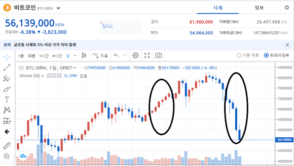 예시를 들어보겠습니다 윗 사진은 지난 2021년 비트코인 호황기때 차트 입니다