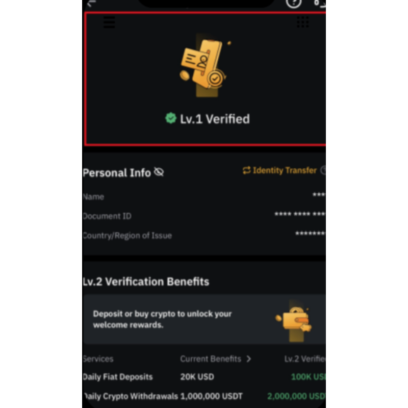 bybit 모바일 어플을 다운받아주신 후 회원가입 한 이메일 또는 휴대폰 번호로 로그인을 해 준 다음 윗 사진을 보시면서 kyc 인증을 해주시면 되겠습니다 운전면허증 신분증을 선택하여 핸드폰 사진으로 찍어 업로드한 후 셀카 촬영을 차례대로 진행하고 난 뒤에 위와 같은 창이 뜨게됩니다. 바로 LV·1이 인증되는데, 이 때 소요되는 시간은 대략 5분 정도입니다.