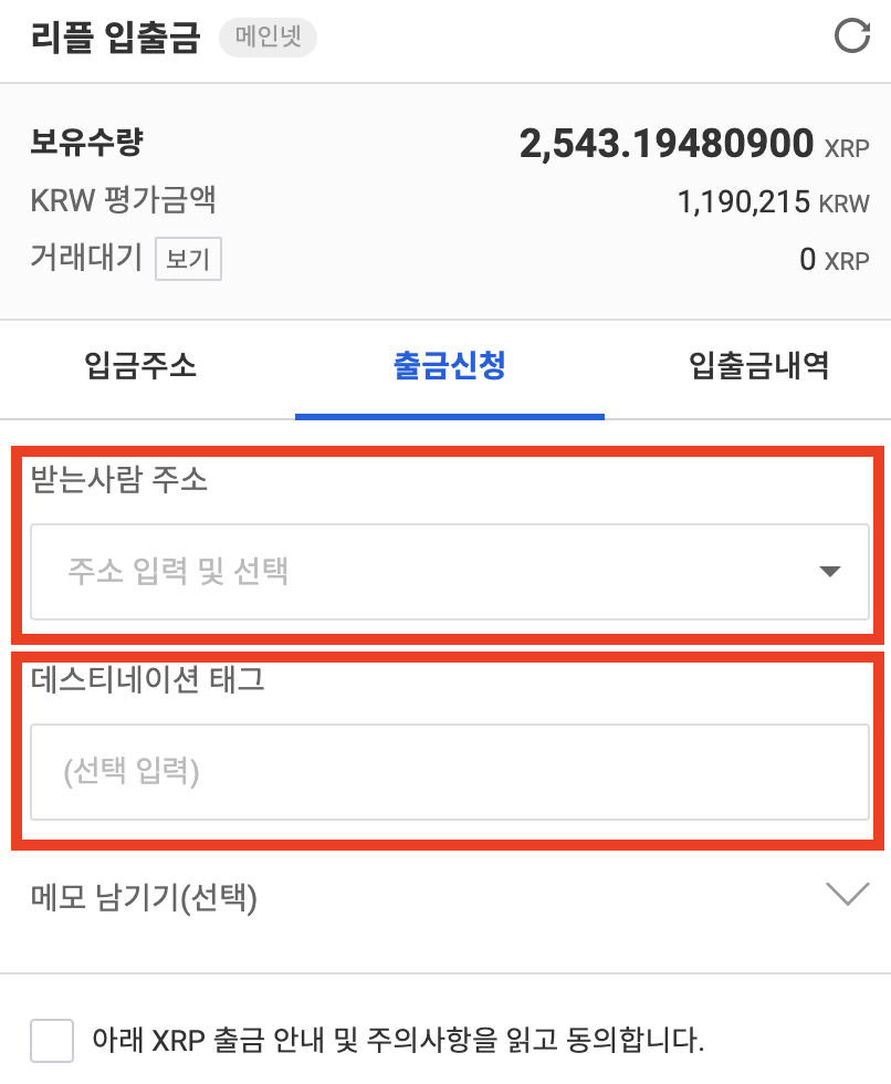 바이비트(Bybit) 입금 주소 생성 후, 국내거래소에서 리플(XRP) 출금신청을 합니다. 출금 수량을 입력 후, 확인을 클릭하면 아래와 같은 화면이 나옵니다. 여기서 바이비트(Bybit) [XRP Wallet Address]는 [받는사람 주소]에 입력하고, [XRP Deposit Tag/Memo]는 [데스티네이션 태그]에 정확하게 입력합니다.